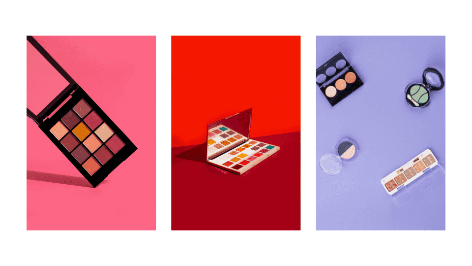 アイシャドウ・チークなどのメイク用品は、華やかな写真演出もおすすめです。商品ブランドのイメージカラーと同系色の背景と小物にすると、鮮やかさとまとまりを両立できます。
