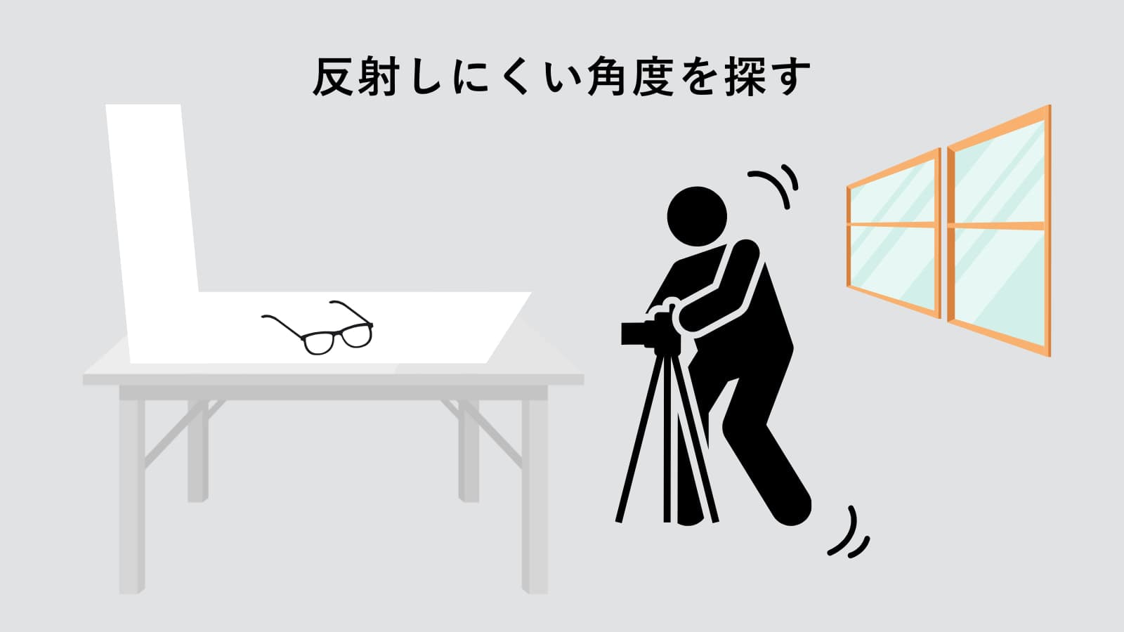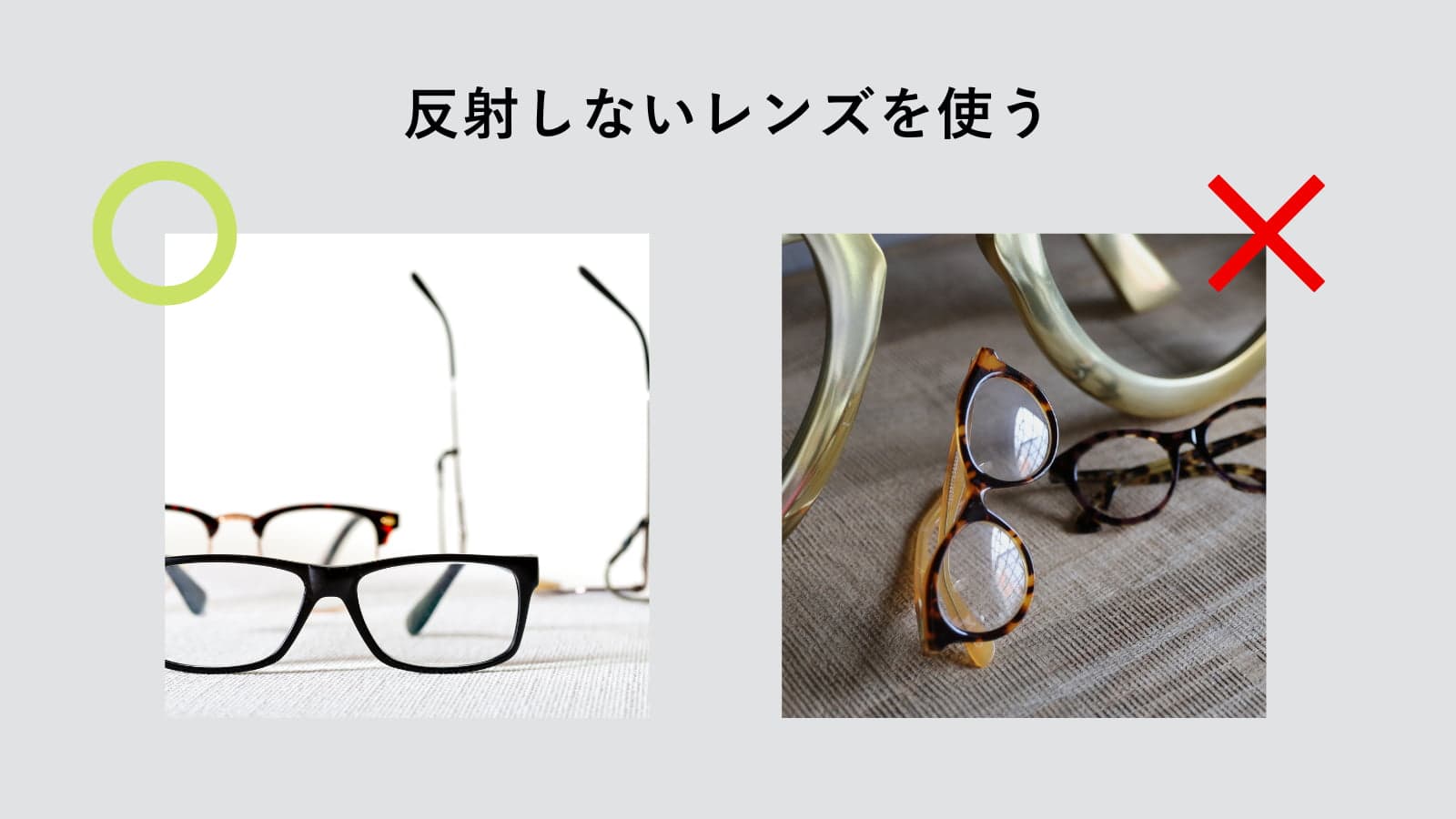 メガネのレンズは反射しやすいため、自然光で撮影する場合は反射しにくい角度や高さを探す必要があります。照明についても、強すぎないように光を抑えたり、角度を変えるなど調節してレンズが反射しないように工夫しましょう。特に正面からの光は反射しやすいので注意が必要です。