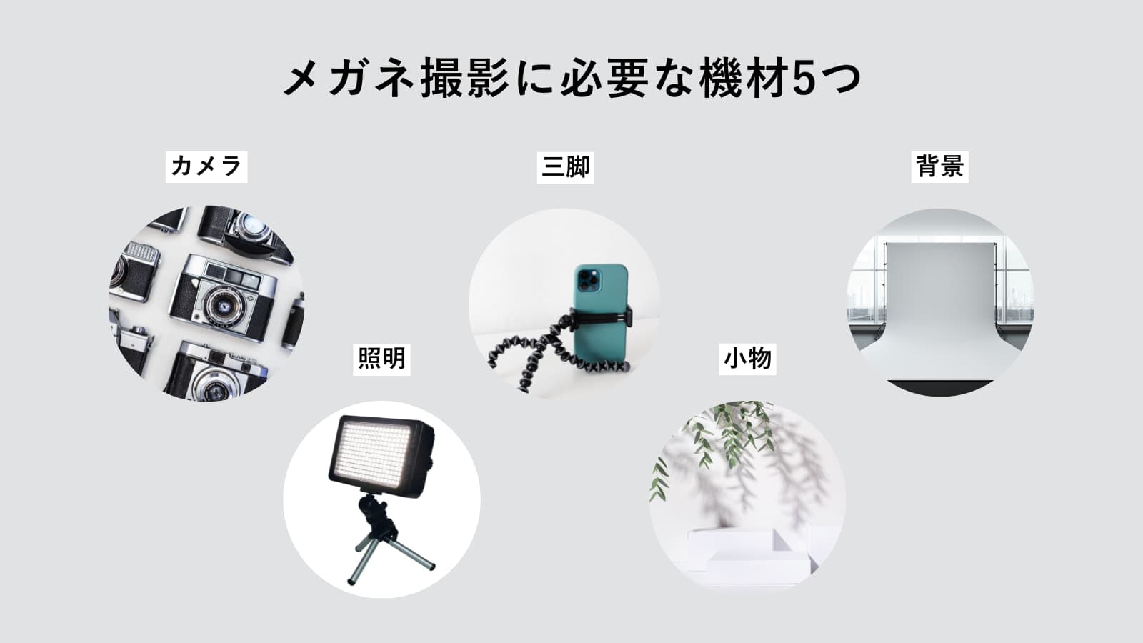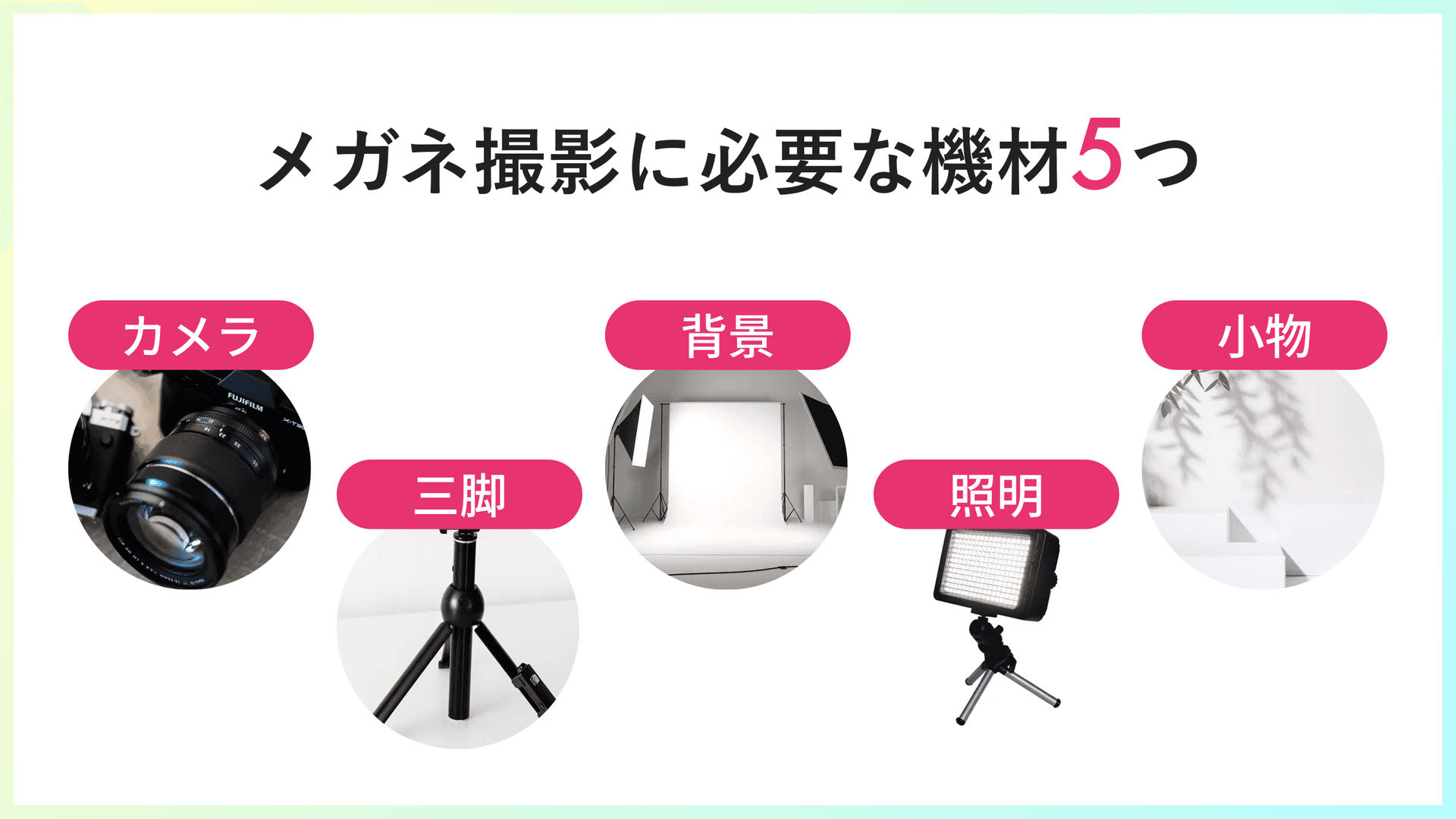 メガネを上手く撮影するには、カメラ、三脚、照明、背景、小物の5つの機材が必要です。それぞれの詳細については以下の通りです。