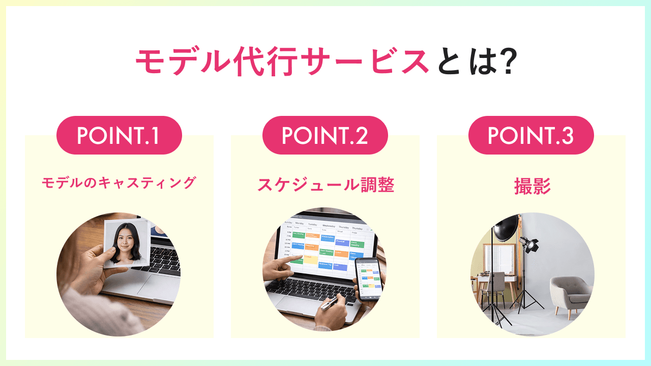 モデル撮影代行サービスとは、モデルのキャスティングからスケジュール調整、撮影までを代行するサービスのことです。