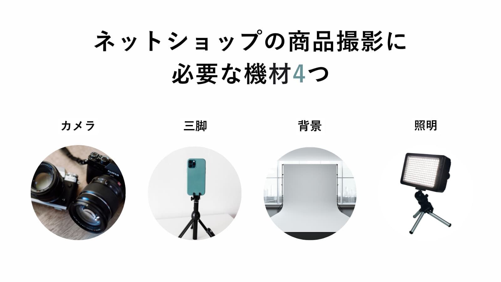 ネットショップの商品撮影をする際は、カメラ、三脚、背景、照明の4つが最低限必要です。それぞれの詳細は以下の通りです。