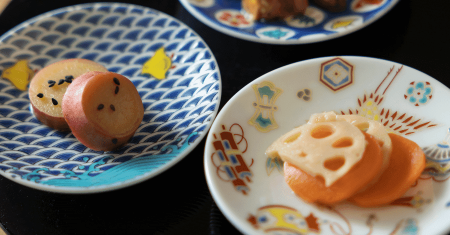 料理や小物を三角形になるように配置。料理にピントを合わせて撮影するのがポイント。