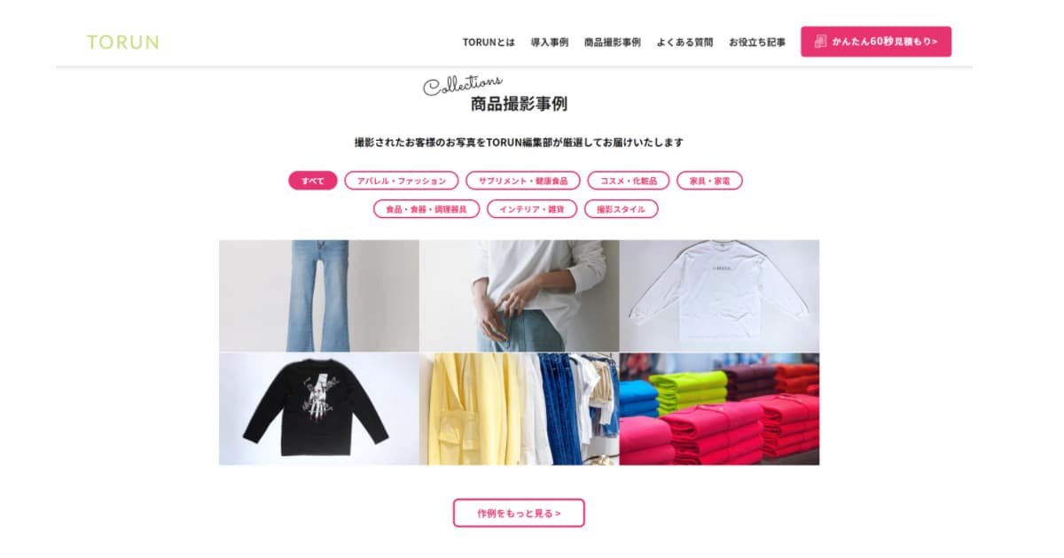 商品紹介動画を依頼するなら「TORUN」がおすすめ。TORUNは商品を送るだけで、プロが撮影した高品質な商品紹介動画を手に入れることができます。物撮りや商品撮影にも対応しているので、気になる方は一度無料お見積もりをご依頼ください!