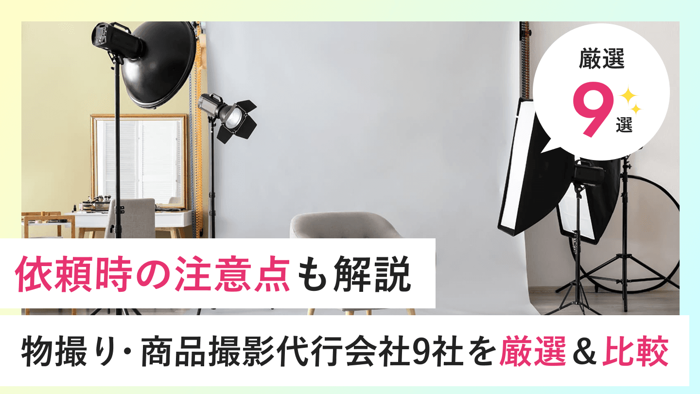 この記事では、物撮り・商品撮影代行会社を探している方向けに9社を厳選し、価格や依頼しやすさ、得意な商品ジャンルなどを徹底比較しました。また、依頼するメリットやデメリット、依頼の流れなども解説しているので、ぜひ最後までご覧ください!