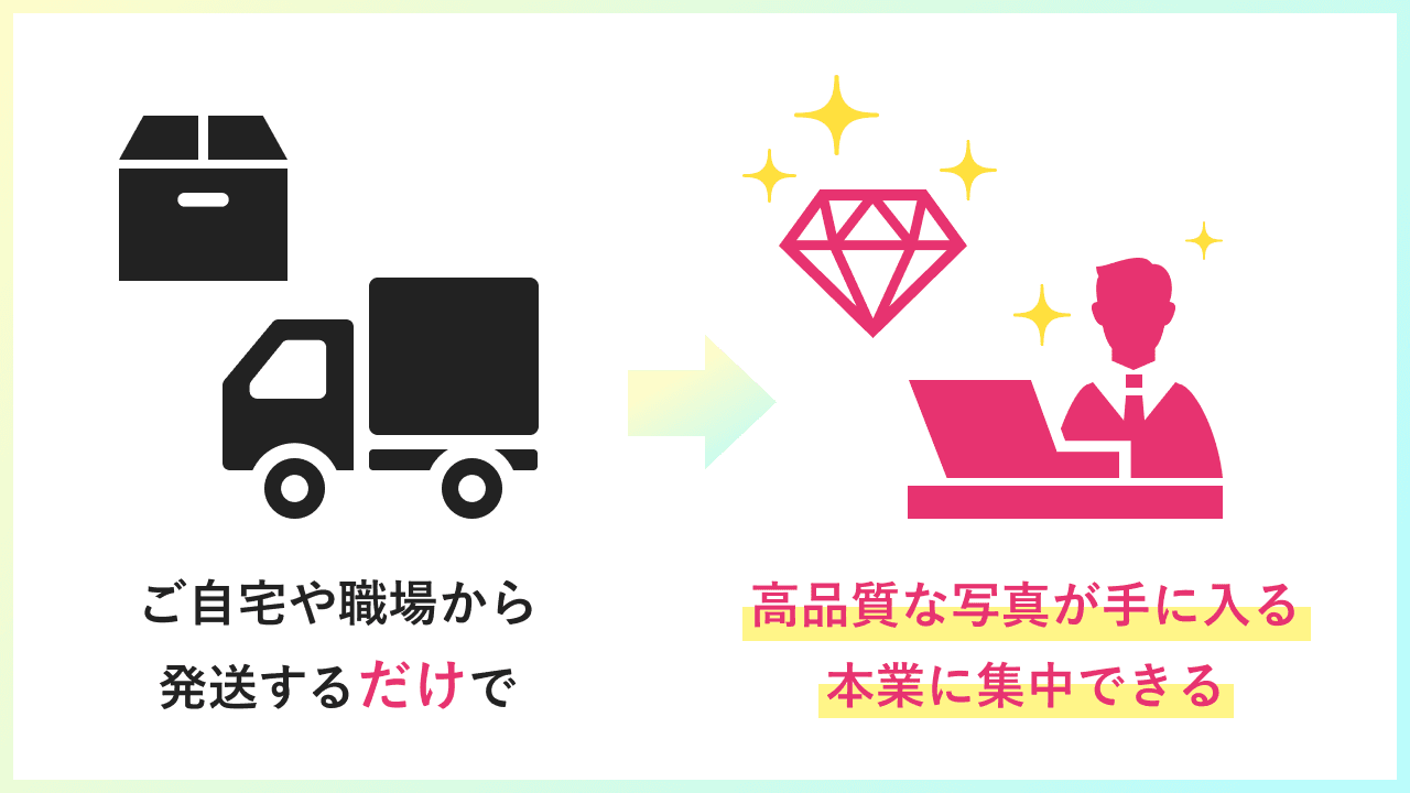 ・商品を送るだけで高品質な商品写真が手に入る ・全国対応だから遠方にお住まいの方でもOK ・1枚からご依頼可能(1枚980円〜)