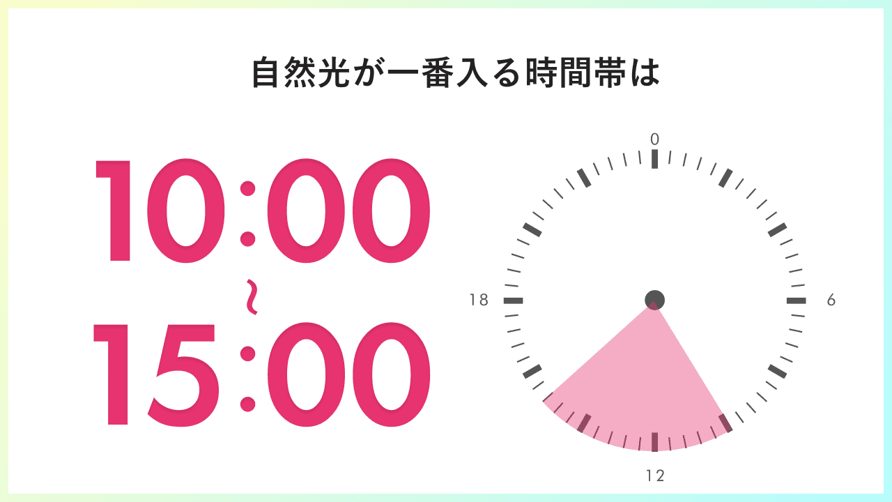 自宅の中で撮影に適した場所は、部屋の中で最も光が多く入る窓のそばです。撮影する時間帯は明るい日光が差し込む、午前10時から午後15時が良いでしょう。日光が強すぎるときは、薄手のカーテンなど遮光性が低いもので光を和らげてください。